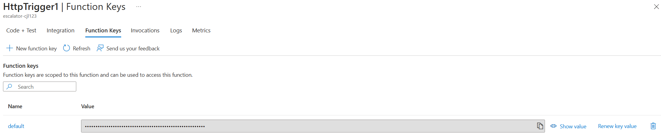 By default the function key value is hidden. Show the default function key value by selecting Show value. Copy the contents of the Value field to the clipboard, and then store this key in Notepad or a similar app for later use.