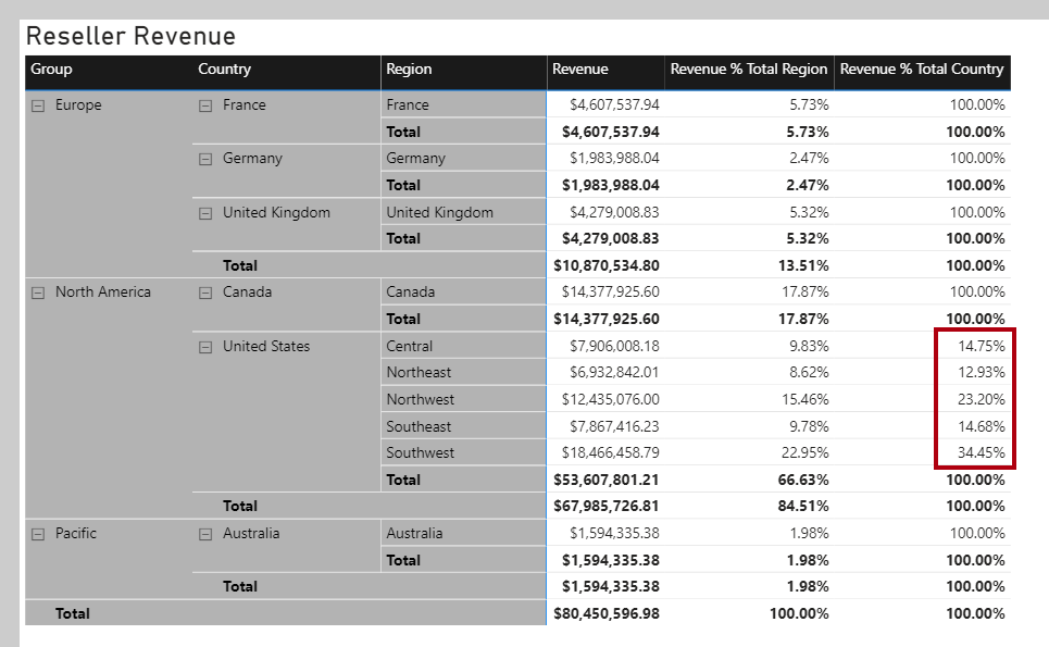 Notice that each Revenue Total Region measure value is the same. It's the value of total revenue.
