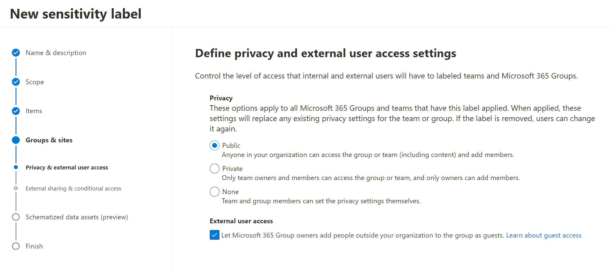 Privacy: Keep the default of Public if you want anyone in your organization to access the team site or group where this label is applied.