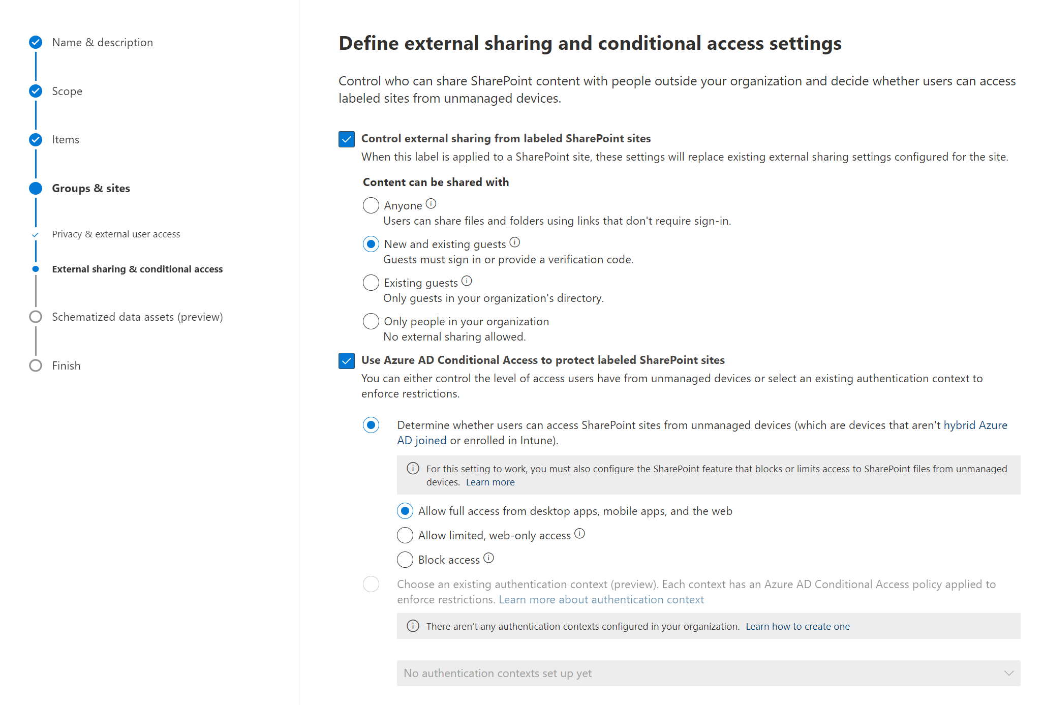 To configure the Control external sharing from labeled SharePoint sites and Use Azure AD Conditional Access to protect labeled SharePoint sites setting.