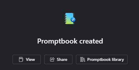 A pop-up window appears once your promptbook is created. From this window, you can select to view the promptbook you just created and then run it or edit it, share your promptbook via link, or go to the promptbook library.