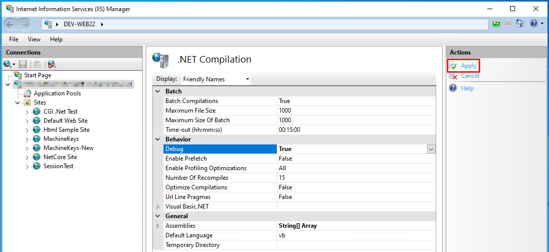 Select the Apply button from the right-hand side pane of IIS Manager to save the changes to the IIS configuration: