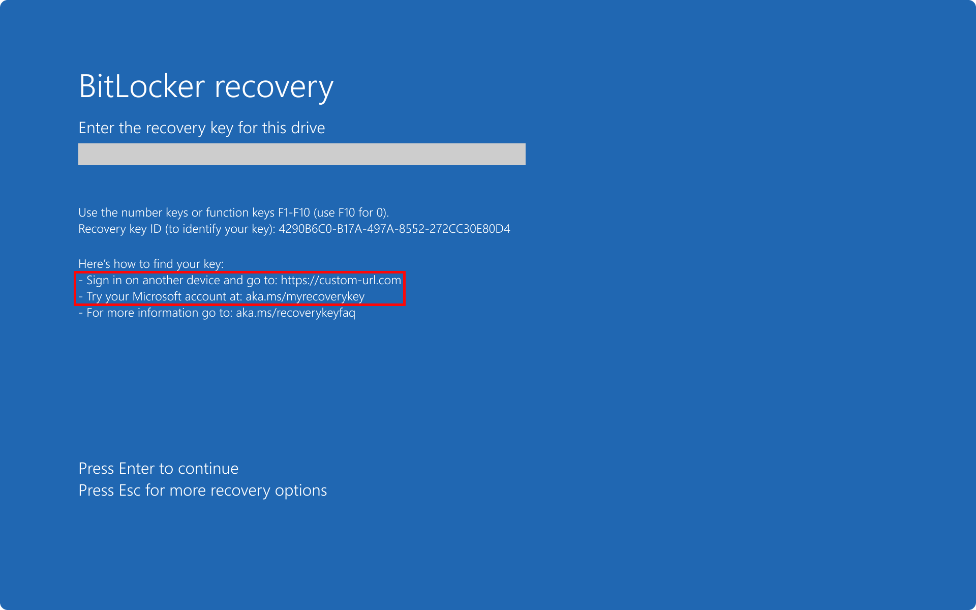 With BitLocker policy settings, you can configure a custom recovery message and URL on the BitLocker preboot recovery screen. The custom recovery message and URL can include the address of the BitLocker self-service recovery portal, the IT internal website, or a phone number for support.