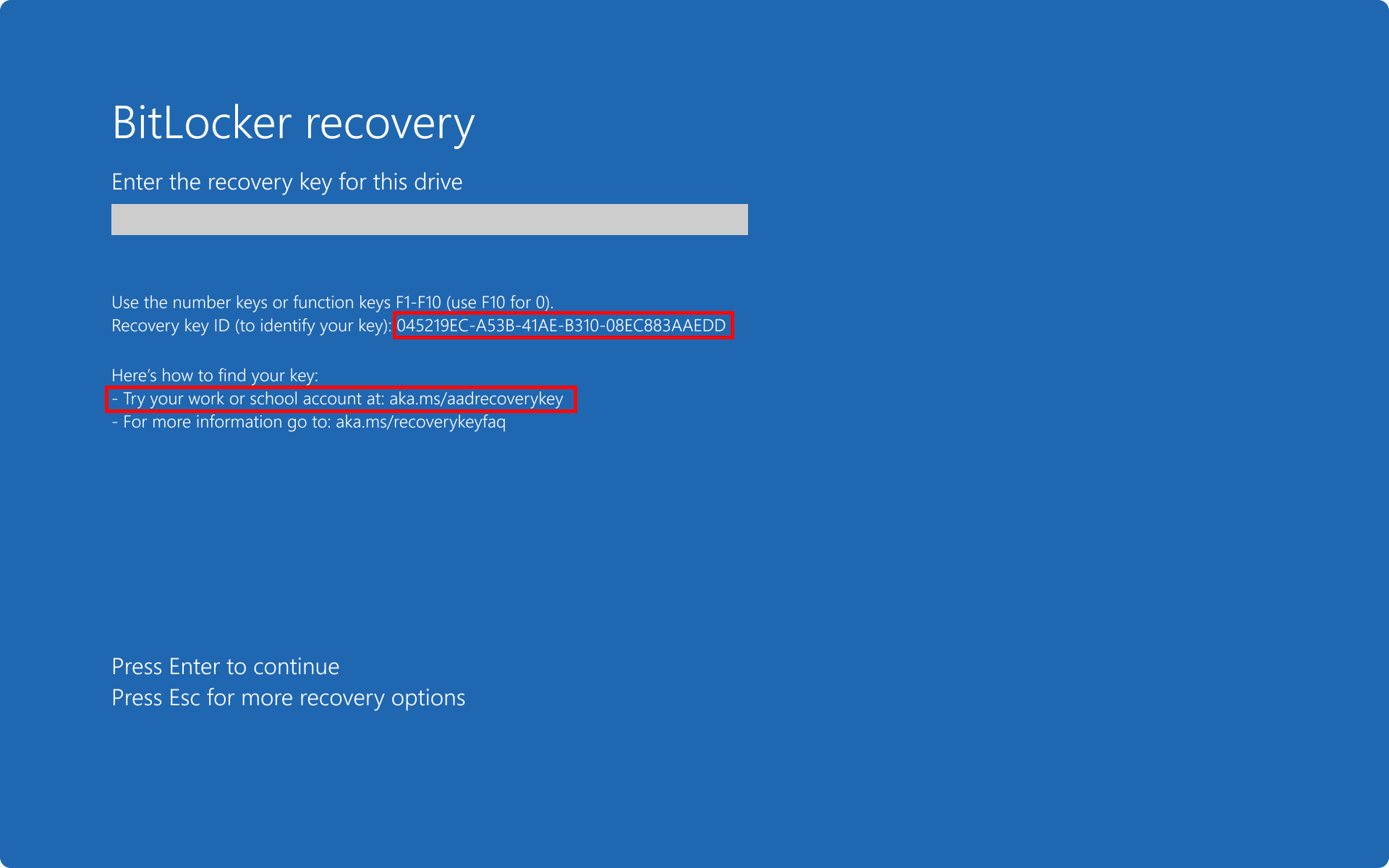 Starting in Windows 11, version 24H2, the BitLocker preboot recovery screen includes the Microsoft account (MSA) hint, if the recovery password is saved to an MSA. This hint helps the user to understand which MSA account was used to store recovery key information.
